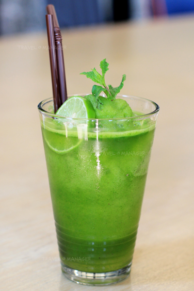 เมื่อมาถึงที่ร้านแล้ว ขอนั่งให้คลายร้อนกันก่อน เลยขอสั่ง เลมอนมิ้นต์ (75 บาท) มาดื่มให้ชื่นใจ เมนูนี้เป็นน้ำหวานๆ เย็นๆ ที่ปรุงออกมาแบบกึ่งน้ำสมุนไพร โดยจะใช้ใบมิ้นต์มาปั่นกับน้ำเลม่อนและน้ำแข็ง ใส่น้ำเชื่อมเพิ่มรสชาติอีกหน่อย ได้ออกมาเป็นน้ำปั่นเลม่อนมิ้นต์ที่รสชาติเปรี้ยวอมหวาน หอมใบมิ้นต์ กินแล้วชื่นใจ