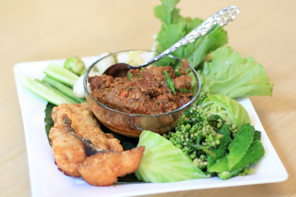 พอเริ่มเย็นกายเย็นใจแล้วก็ขอมาจัดหนักกับอาหารอร่อยเสียหน่อย เริ่มจาก ตำปูปลาร้าหมูกรอบ (150 บาท) เมนูเด็ดของร้าน จานนี้เป็นเมนูอีสานแบบแซบๆ ที่ต้องสั่งตรงปลาร้ามาจากภาคอีสาน นำมาต้มสุก ส่วนมะละกอนั้นก็จะสับสดๆ จานต่อจาน ใช้มะนาวสดแท้ๆ ตำรวมกัน โรยหน้าด้วยหมูกรอบที่ทางร้านทำเอง เป็นหมูกรอบเนื้อเยอะ ไม่มันจนเกินไป ลองชิมแล้วนัวปากมากๆ รสชาติจัดจ้านถึงเครื่องดีจริงๆ